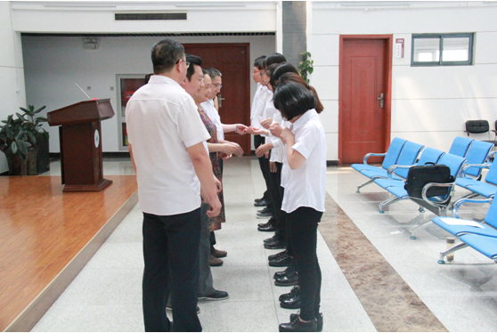 紧接着,林艳书、王敏达、刘联胜、黄超、闵春华、王恩宇、杨华、李辉八位老党员为新党员代表佩戴党徽。老党员和蔼而又充满期许的走到新党员的面前,新党员双手接过党徽,同时也接过了党员的责任,接过了党员的信仰,更接过了社会主义建设的重担。