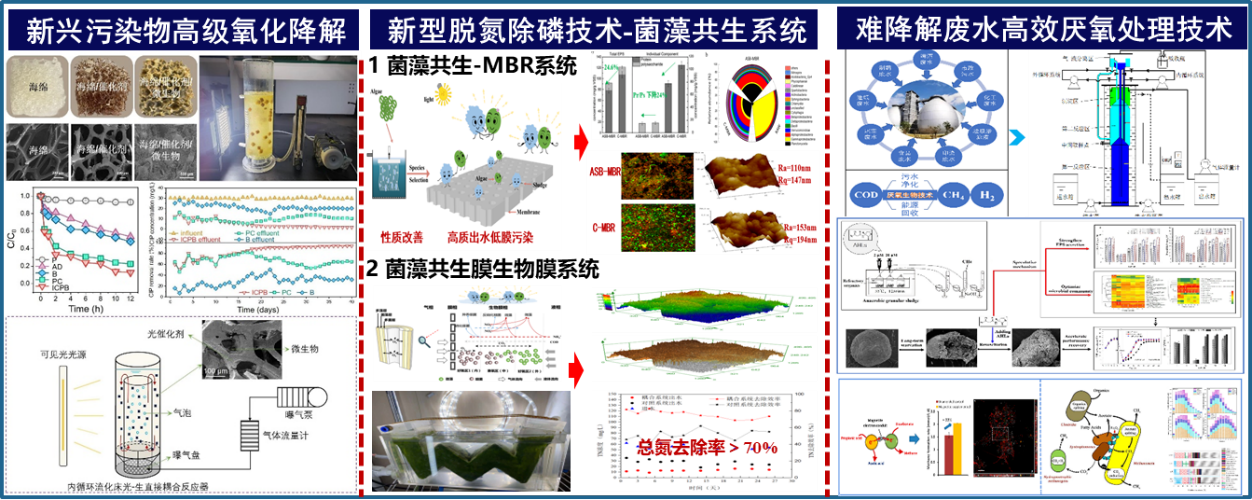 研究水处理系统中物质转化、电子传递、能量转移及微生物代谢等微观机制,结合新材料、新工艺和新方法,并将其应用于饮用水、生活污水及各种工业废水处理领域。
