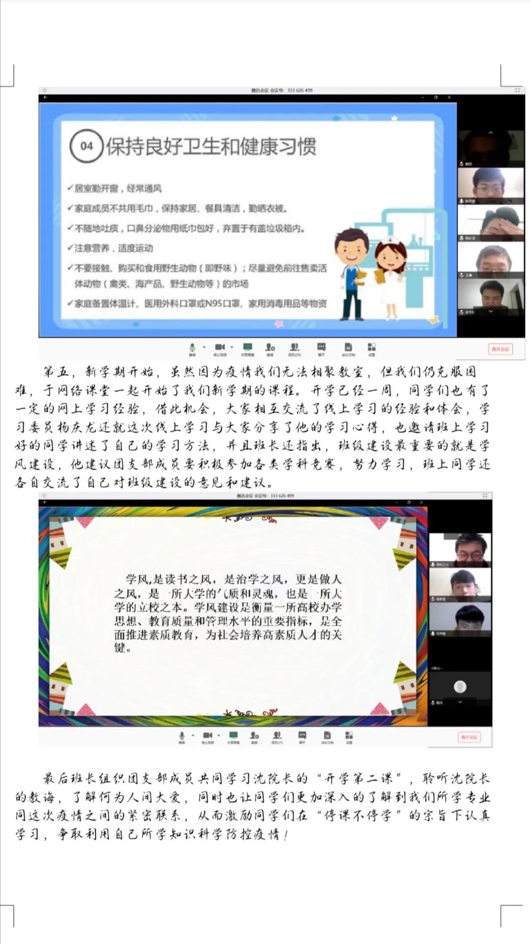 通过腾讯会议,同学们又以一种特别的方式相见了,大家相互调侃畅谈,在言语中也可以感受到同学们在为这场疫情攻坚战做着力所能及的贡献。