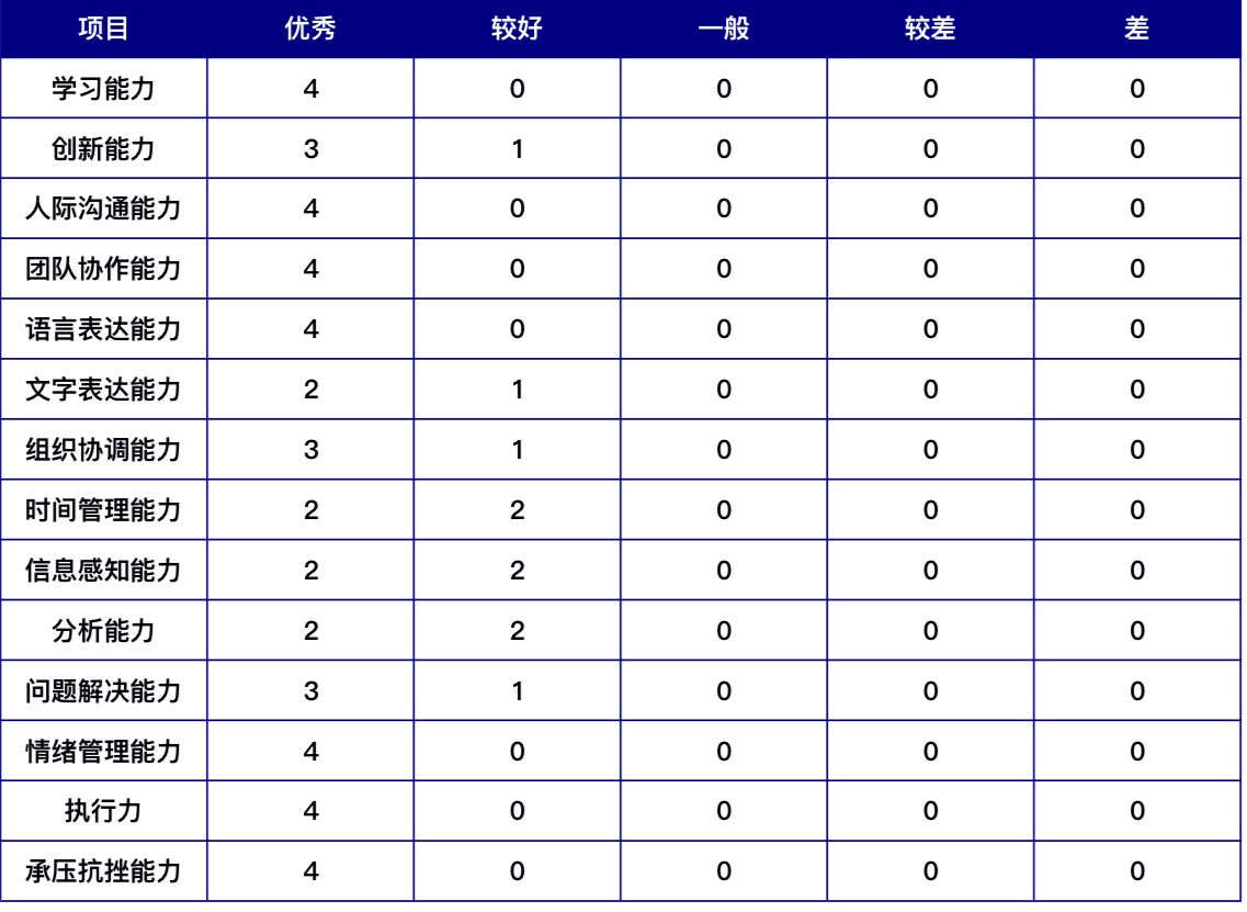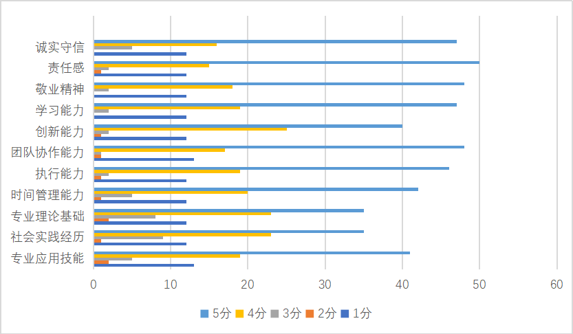 毕业生持认可的态度,特别是学习能力、人际沟通能力、团队协作精神和承受坐着与失败能力等方面都给予好评,但是创新能力和组织管理能力还是有待提高,这也对今后在校生的培养侧重点提出了可参考的建议。