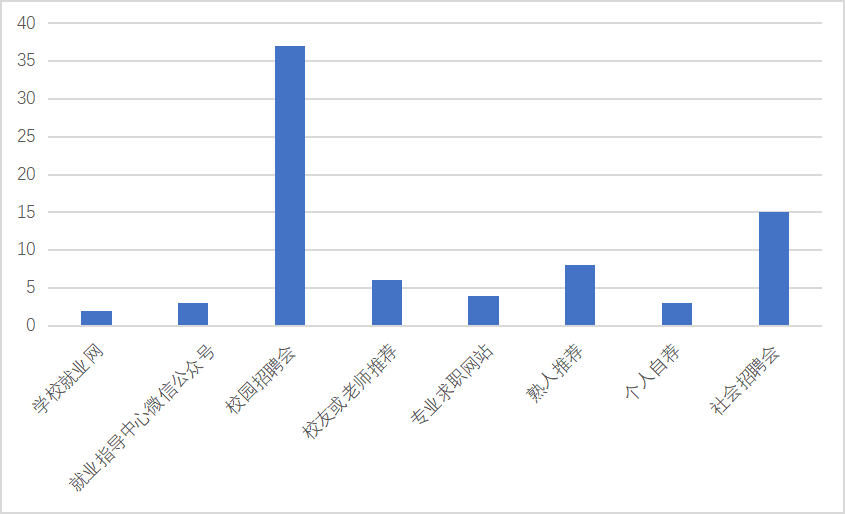 已就业的毕业生中,获得工作的主要渠道为校园招聘会,其次依次为社会招聘会、专业求职网站、熟人推荐、校友或老师推荐等。因此,在今后的工作中,我们要一如既往的重视校园招聘,并注重开发新的就业渠道,为学生提供更多的就业机会。