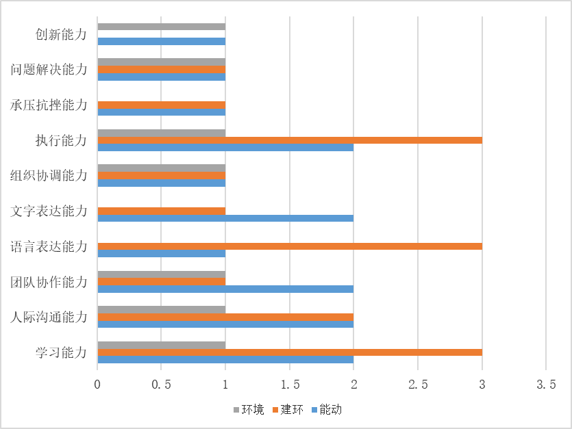 人才培养、就业教育等工作的意见建议,调查并总结了单位招聘时注重的毕业生能力,其中包括学习能力、创新能力、人际沟通能力、团队协作能力等。由下表可知,建环专业招聘单位更为注重学习能力、语言表达能力、执行能力;能动专业较为注重学习能力、团队协作能力、人际沟通能力、文字表达能力、执行能力;环境工程专业注重学生综合能力,可以得出结论,在校生应注重培养自主学习能力,锻炼自己的语言表达能力,加强团队协作,有合作意识,为以后的就业打下良好的基础。