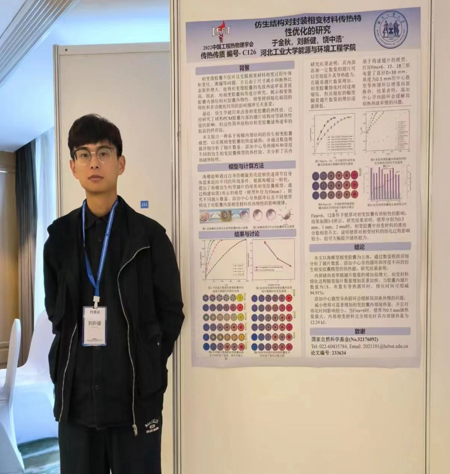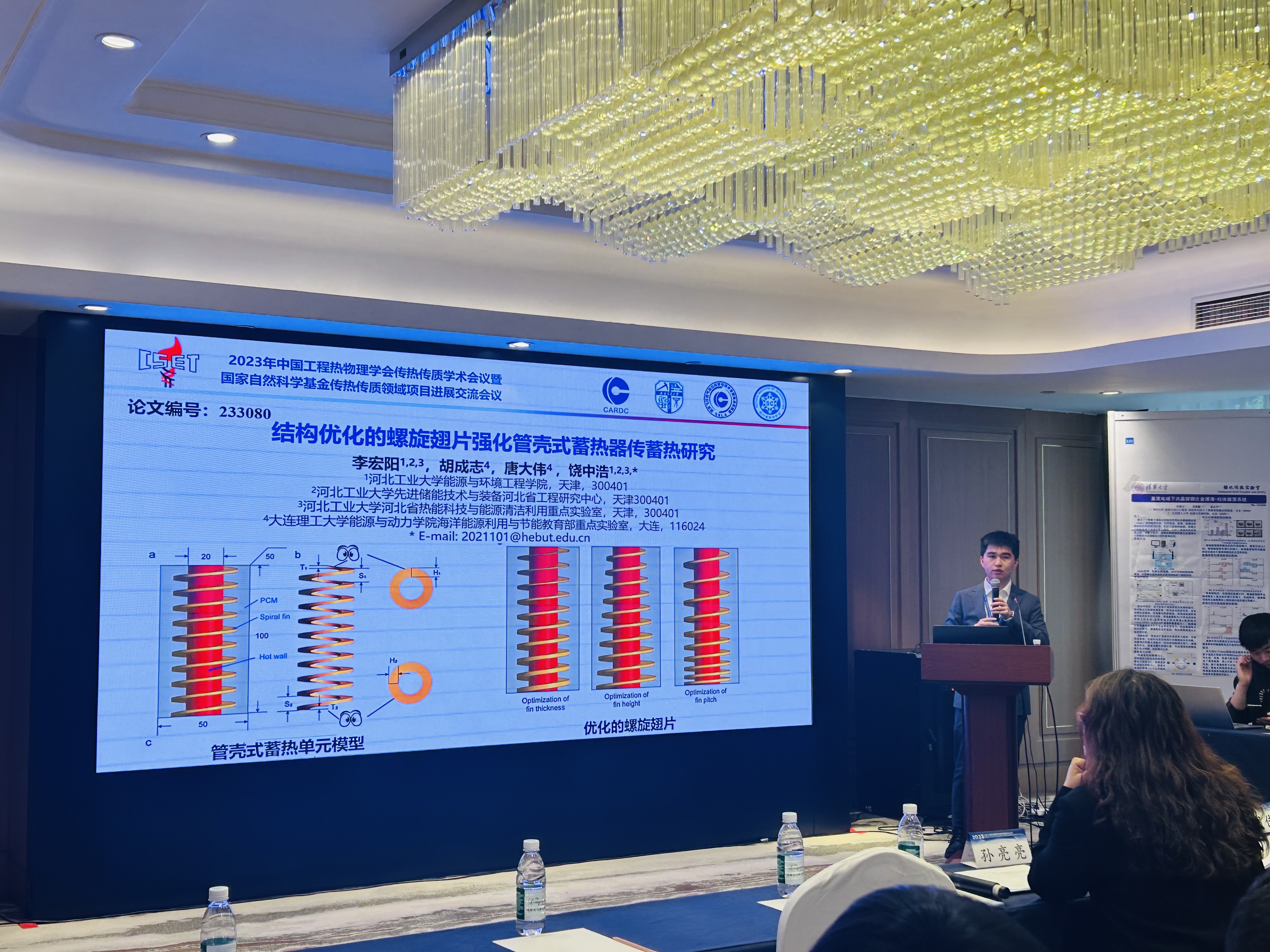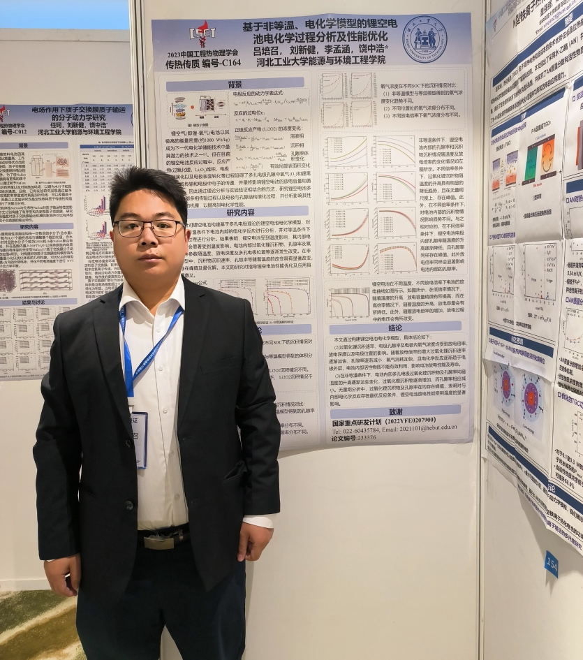 李宏阳老师在会上进行了《结构优化的螺旋翅片强化管壳式蓄热器传蓄热研究》的口头汇报,提出了一种优化设计的螺旋翅片结构,分析并总结了优化结构强化传蓄热的内在机制;吕培召老师在会上进行了《非等温、电化学模型的锂空电池电化学过程分析及性能优化》的墙报展示,分析了非等温过程对锂空电池电化学反应的影响,并对非等温条件下的电化学过程进行分析;聂昌达老师在会上进行了《基于空气和相变材料耦合的锂离子电池热管理性能研究》的墙报展示,分析了定型相变材料厚度、风速对电池温度均匀性和最高温度的影响,该方法实现了电池组整体的散热和相变材料长时储热。