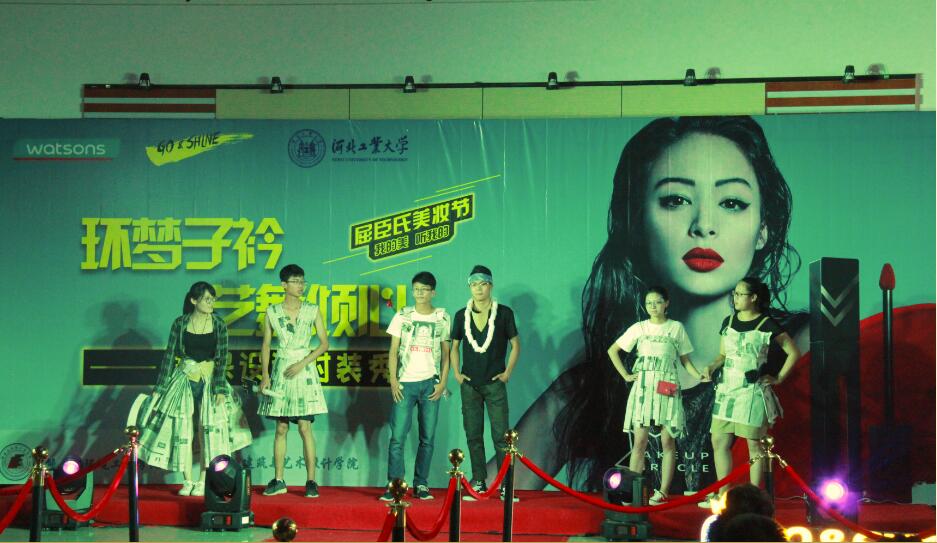 紧接着由宣传部的同学进行废物时装走秀展示。简单的布料、报纸及硬卡纸拼凑而成的完美服饰,以及风格多样的展现形式,将本次环保时装秀活动推向高潮。