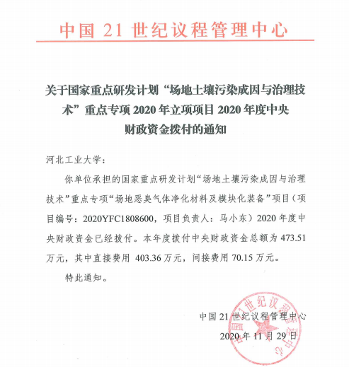近日,国家科技部公布了国家重点研发计划“场地土壤污染成因与治理技术”重点专项2020年度项目立项结果,我校SM调教 马小东教授牵头申报的“场地恶臭气体净化材料及模块化装备”项目获批立项(项目编号:2020YFC1808600),项目总经费1947万元,其中中央财政经费947万元。该项目是我国“场地土壤污染成因与治理技术”重点专项启动3年以来,我省在该领域获批的首个项目。